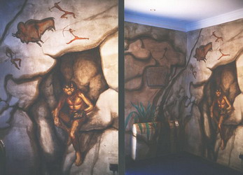 hand-painted faux bois mural (designed to match the genuine hardwood