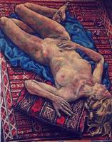Painting, oils on canvas. Isabel on Moroccan carpet.